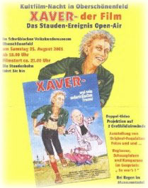 Am 25.08.2001 war es so weit. Im ehemaligen Kloster und jetzigen Volkskundemuseum Oberschönenfeld bei Gessertshausen nahe Augsburg fand das legendäre Xaver-Fest statt. Angereist aus Köln waren Regisseur Werner Possardt und Co-Produzent Uwe Franke, um gemeinsam mit den Fans des Films eine große Party zu feiern. Durch unsere lieben Freunde, die Familie Eberle aus Mittelneufnach, erfuhren wir vom Fest. Für uns 12 Fans war es natürlich selbstverständlich, die 200 km vom Schwarzwald in die Stauden zu fahren und zu feiern. Durch Zufall lernten wir Markus Zaha kennen, der uns freundlicherweise die Tickets besorgte.