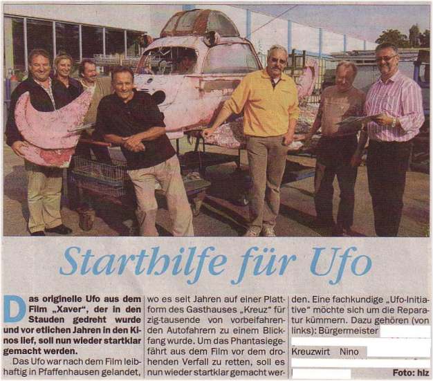 Das leider schon sehr ramponierte Xaver-Raumschiff, das auf dem Dach einer Gaststätte in Pfaffenhausen steht, wird nun doch renoviert. Nachdem Uwe Franke, Gottfried Wenger und unser Axel sich über den traurigen Zustand des Raumschiffs unterhalten hatten, setzte Gottfried wieder mal die Hebel in Bewegung und suchte sich Mithelfer. Somit können wir davon ausgehen, dass das Raumschiff bis zum nächsten Event wieder in alter Frische erstrahlt.